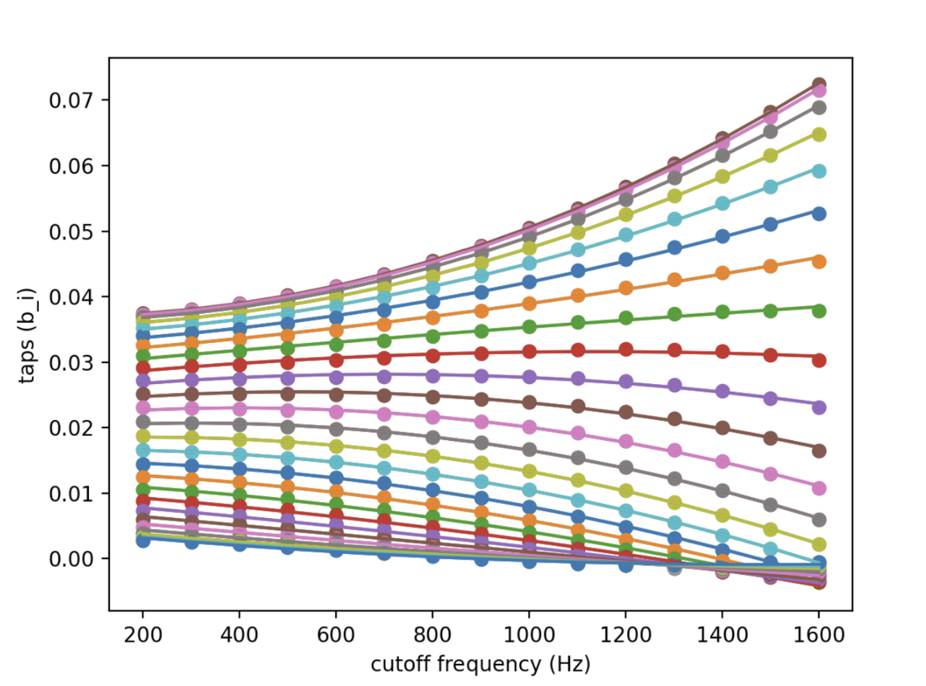 The FIR low-pass filter was designed to have 51 taps using the window method, as implemented by the firwin function in the SciPy Signal Processing library. This number was determined experimentally. Through trials with a varying number of taps, 51 was one of the lowest numbers where the audio filtering was noticeable. The 51 taps were then calculated for 15 cutoff frequencies, spanning from 200 Hz to 1.6 kHz.