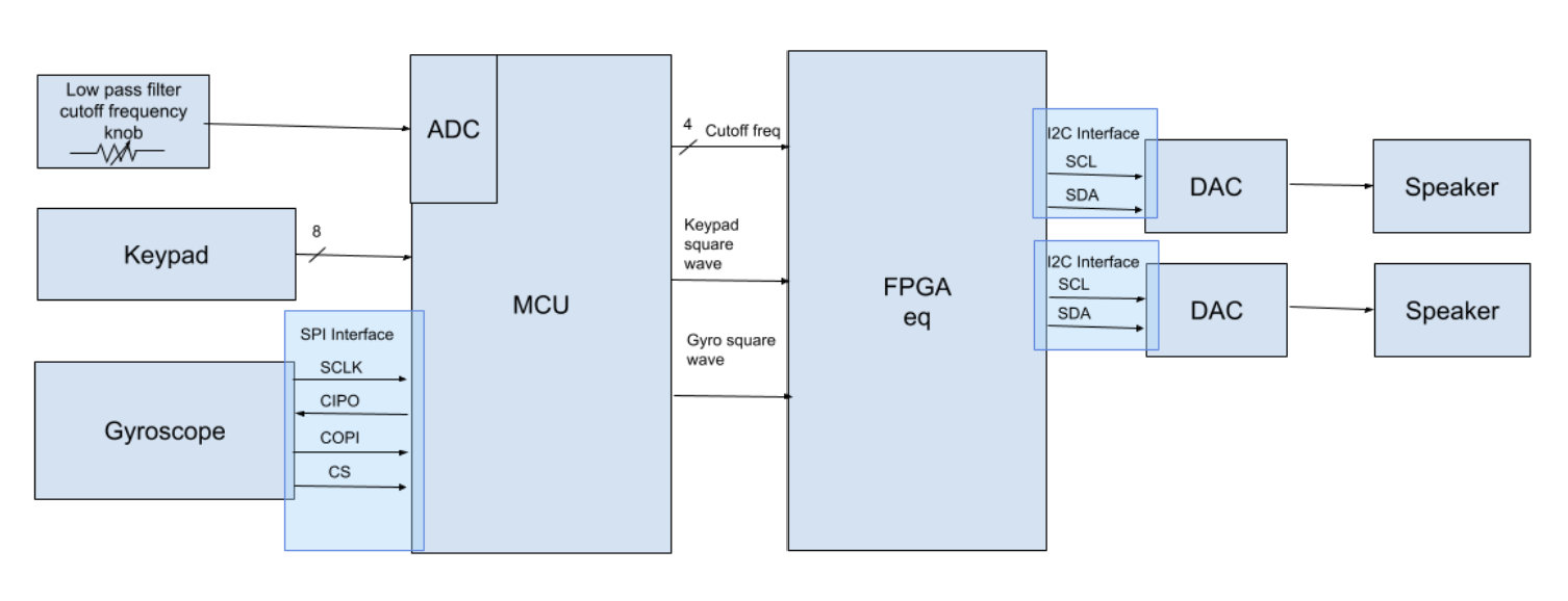 The original plan was for the MCU to handle all user input (from the gyroscope, keypad, and potentiometer knob), and to forward those results (two square waves, and 4 bits encoding the potentiometer knob reading) to the FPGA for processing. The FPGA would then filter the digital waveforms using a FIR low-pass filter, with the cutoff frequency determined by the potentiometer reading. Then, the FPGA would send the filtered audio signals to two DACs over I2C to ultimately drive two speakers. Due to unforeseen challenges, we ended up not filtering the audio signal and driving the speakers directly with the MCU.